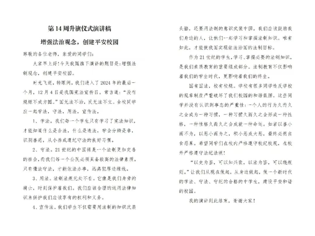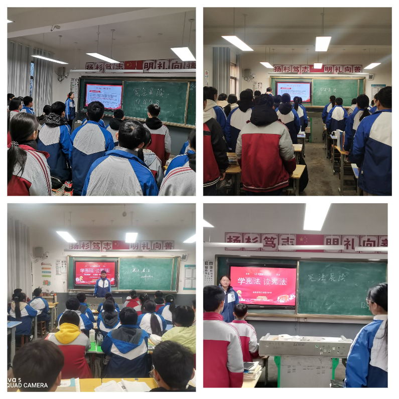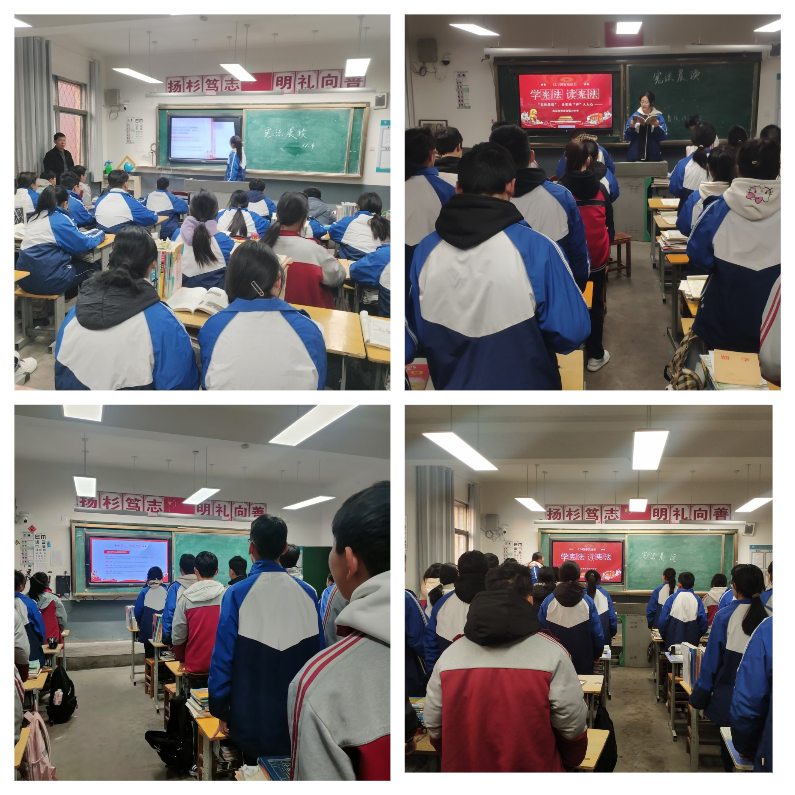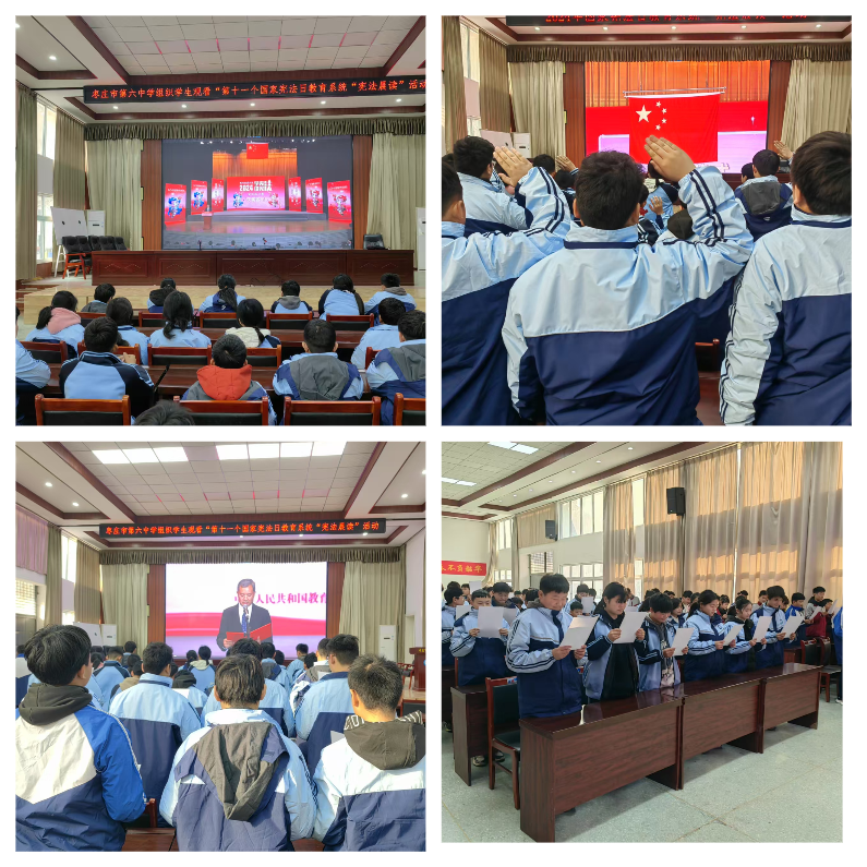 法者,国之权衡也,时之准绳也 2024年12月4日是 第十一届国家宪法日 12月1日至12月7日是 第七个“宪法宣传周” 2024年“宪法宣传周”主题为 大力弘扬宪法精神 推动进一步全面深化改革 为认真学习贯彻习近平法治思想和习近平总书记关于宪法法治教育的重要指示,营造宪法学习教育的浓厚氛围,加深全体师生对宪法的认识和了解,提高法治意识和法治素养,山东省枣庄市第六中学组织开展“国家宪法日”宣传教育系列活动。 01升旗仪式讲宪法 12月2日,八年级1班孙楚涵和八年级2班侯瑞清同学进行《增强法治观念,创建平安校园》为主题的国旗下讲话,德育副校长张巍结合我校近期违规违纪现象普及相关宪法知识,倡导同学们增强法律意识,养成遵纪守法的好习惯。 02主题班会学宪法 03琅琅晨读诵宪法 12月4日,利用晨读课时间组织各班级进行“宪法晨读”活动,诵读宪法知识。上午9:00,在我校多功能报告厅,组织学生观看第十一届国家宪法日教育系统“宪法晨读”活动。 04法治报告知宪法 12月4日下午3:00,邀请枣庄市公安局台儿庄分局治安管理大队大队长、枣庄市第六中学法治副校长晁福海同志到我校进行法治教育。 张巍校长结合我校实际情况总结指出:“希望同学们通过今天的报告会,将宪法精神铭记于心,在今后的学习和生活中,时刻以宪法为准绳,规范自己的言行举止,积极传播法治理念,共同营造风清气正、和谐有序的校园法治环境。从点滴小事做起,做一名知法、懂法、守法、用法的好公民,为构建法治社会贡献自己的力量。” 通过开展此次“宪法宣传周”系列活动,营造了浓厚的法治校园文化氛围,增强了全体师生法律意识。今后,我校将持续开展形式多样的法治宣传教育活动,切实推进依法治校、依法执教。