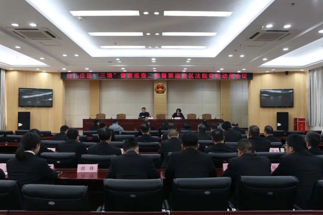 12月1日,台儿庄区“三项”督察巡查二组督察巡查区法院党组动员会召开,区委政法委启动对区法院党组“三项”督察巡查工作。督察巡查二组组长、区委政法委分管日常工作的副书记赵常国,督察巡查二组副组长、区委政法委政治部主任王海涛、区法学会专职副会长杜宗泉以及督察巡查二组全体成员出席会议,区法院中层副职以上干警参加会议。 会上,赵常国组长安排部署了此次督察巡查的主要工作任务,强调“三项”督查巡查是推进政法系统全面从严管党治警的重大举措,是完善党内监督体系的战略性制度安排,是对区法院党组的一次“政治体检”,是对法院全体干警党性觉悟的现实检验,对进一步加强党对法院工作的绝对领导、全面领导,打造过硬法院队伍具有重要的意义,要求区法院党组及法院干警要提高政治站位,自觉接受督察巡查。 台儿庄区人民法院党组书记、院长何艳真代表院党组作了表态发言:一是要提高政治站位,切实把思想和行动统一到督察巡查工作部署上来。全院干警要深刻领悟开展督察巡查工作的重要意义,增强接受巡查监督的政治自觉、思想自觉和行动自觉。二是要自觉接受监督、齐心协力完成督察巡查工作任务。要树牢一盘棋意识,把配合督察巡查与当前审判执行各项工作结合起来,对标跟进、主动高效推进。三是要切实转变理念,全面抓实抓好督察巡查成果转化。要以此次督察巡查为驱动,不打折扣认领整改问题,切实把督查巡查整改成果转化为推进法院队伍正规化、专业化、职业化建设,推动法院工作高质量发展的生动实践。 会上发放了民主评议表,对区法院领导班子和班子成员进行了民主评议。