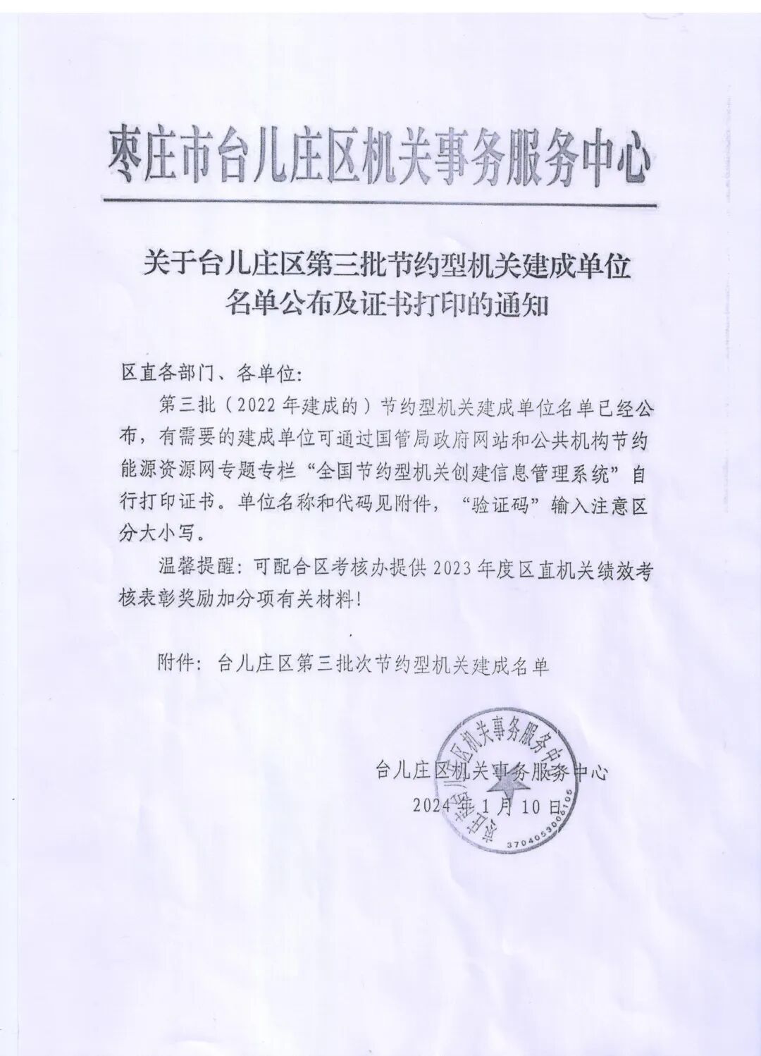 9月19日,经国家机关事务管理局、中共中央直属机关事务管理局、国家发展改革委、财政部联合评选,台儿庄区人民检察院荣获全国“节约型机关”荣誉称号。 近年来,台儿庄区人民检察院不断完善机构建设,加强组织领导,成立节约能源资源工作领导小组,制定节约能源资源工作实施方案与节能工作管理制度,明确负责节约能源资源工作管理机构和工作职责,设置能源资源管理岗位,建立能源资源消费统计台账。加强行为节约、绿色出行、绿色采购、源头减量、分类投放宣传实践,不断降低机关运营成本,实现机关节约节能。 来源:台儿庄区人民检察院