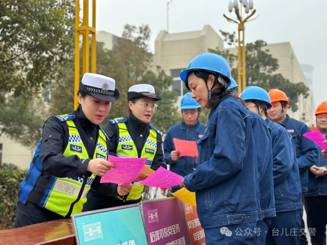 为进一步压实企业主体责任,提升了职工交通安全意识,助力企业安全健康发展,进一步筑牢冬季道路交通安全防线,1月17日,台儿庄交警大队宣传民警走进企业内部,与员工共话交通安全。 在“面对面”的交通安全宣传活动中,民辅警结合日常交通管理工作实际,针对企业负责人、驾驶员及企业员工,向大家深度剖析了各类交通事故高发原因,并警示大家要从案例中吸取教训,时刻敲响警钟,不断提升自身交通安全意识,深刻认识到文明出行、安全行车的重要性。 “希望大家高高兴兴上班来、平平安安回家去。”民警将安全头盔、宣传单及致广大驾驶人的一封信等宣传资料发放到员工的手中时,仍不忘提醒大家在上下班途中一定要自觉遵守交通安全法律法规。 企业负责人表示,要坚守安全生产和交通安全红线,进一步守牢“人人讲安全,事事为安全,遵守交通法规,远离交通事故”底线思维,加大员工的交通安全教育和管理力度,坚决杜绝酒醉驾、疲劳驾驶、超载超员等严重违法行为的发生,争做文明交通参与者和践行者。 来源:台儿庄交警