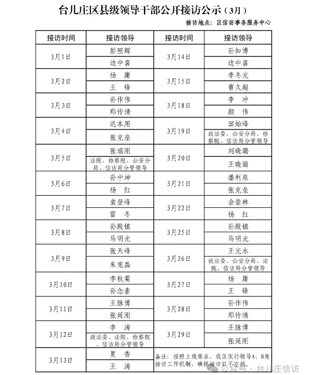 为进一步畅通群众诉求表达途径,解决好人民群众最关心、最直接、最现实的利益问题,充分发挥领导干部在接待群众来访,解决群众诉求,推动积案化解方面的引领示范作用,现将2024年3月份县级领导干部公开接访工作进行公示。来源:台儿庄信访