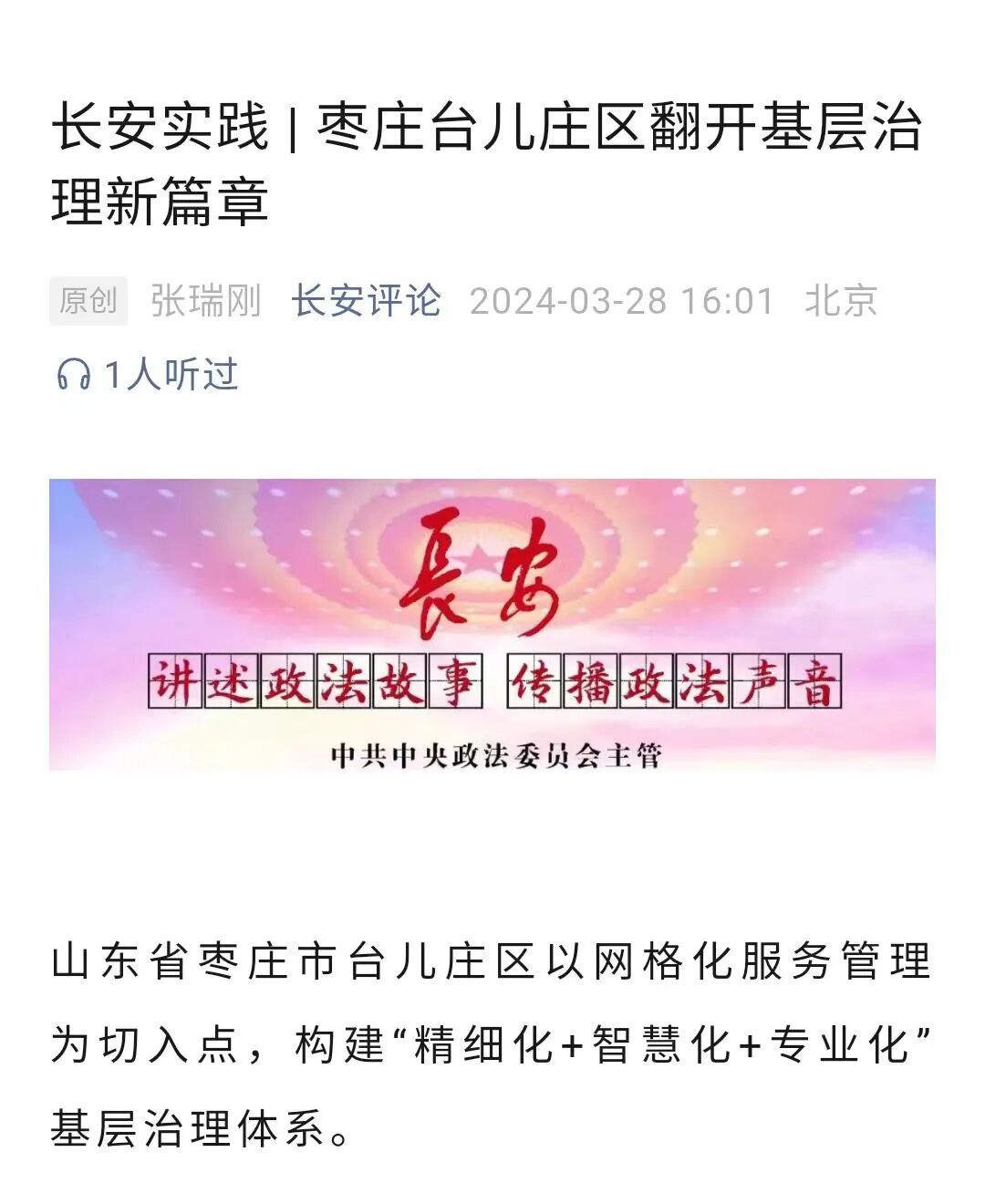 3月28日,中央政法委长安评论微信公众号刊发我区《枣庄台儿庄区翻开基层治理新篇章》文章。 全文如下: 山东省枣庄市台儿庄区以网格化服务管理为切入点,构建“精细化+智慧化+专业化”基层治理体系。 助力基层治理精细化 每年开展一次“梳网清格”行动,不断优化网格设置,明确网格边界,网格地图、网格基础信息同步更新,配齐配强网格队伍,实现定人、定格、定岗、定责、定待遇;在主城区将部分城市基础网格细化出1300余个楼栋微网格,切实构建起“细、密、严、实”的全区一张网。 解决民生问题智慧化 建设1个区级、6个镇(街)级、211个村(社区)级综治服务中心,推动基层日常巡查、研判会商等工作高效衔接;建设政务微信居民群,线上线下联动,利用走访、电话、微信,为网格内行动不便、居住外地的群众提供代办服务;以“枣解决·枣满意”“12345”市长热线等平台为依托,及时了解群众需求、快速回应群众关切、精准解决群众诉求,提前化解矛盾隐患,逐步形成“网格化+大数据+铁脚板”的基层治理模式。 构建一网统管专业化 实施“干部下沉+网格化治理”机制,推动机关党员干部、政法干警下沉网格,协助开展网格工作;推动专业化大网格体系建设,将社区工作者、党建助理员、安全监管员、信访信息员、警务助理、司法协理员等人员统一纳入网格服务团队管理,实现基层力量统一调配、工作统一联动、事项统一处置;实行网格员担任轮值书记制度,常态化、多渠道开展重点人员走访和矛盾纠纷隐患排查;创新“网格+社会组织”机制,在主城区成立网格巡查大队,吸纳老党员、老干部、物业等不同行业志愿者,协助开展网格巡查。